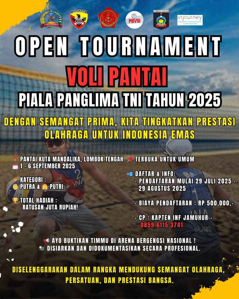 Lombok Tengah, NTB– Komando Resor Militer 162/Wira Bhakti dengan bangga mengumumkan penyelenggaraan Open Turnamen Voli Pantai Piala Panglima TNI Tahun 2025. Ajang kompetisi bergengsi ini akan berlangsung di salah satu destinasi wisata terbaik di Indonesia, Pantai Mandalika, Lombok Tengah. Turnamen ini terbuka untuk umum, baik kategori putra maupun putri. Selasa (29/07/25).