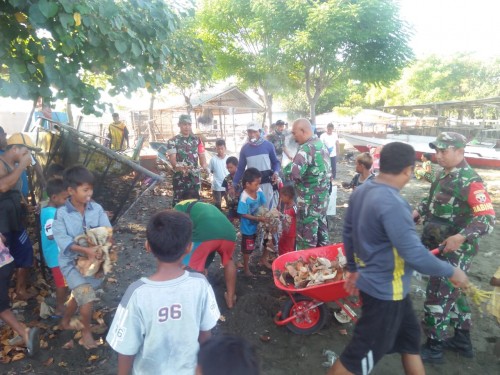 Sumbawa – Puluhan anggota Koramil 1607-09/Utan Rhee melaksanakan pembersihan pantai di Dusun Bajo Desa Labuan Bajo Kecamatan Utan Rhee dengan melibatkan siswa-siswi SDN Labuan Bajo yang sedang melaksanakan liburan kenaikan kelas, Sabtu (5/7).