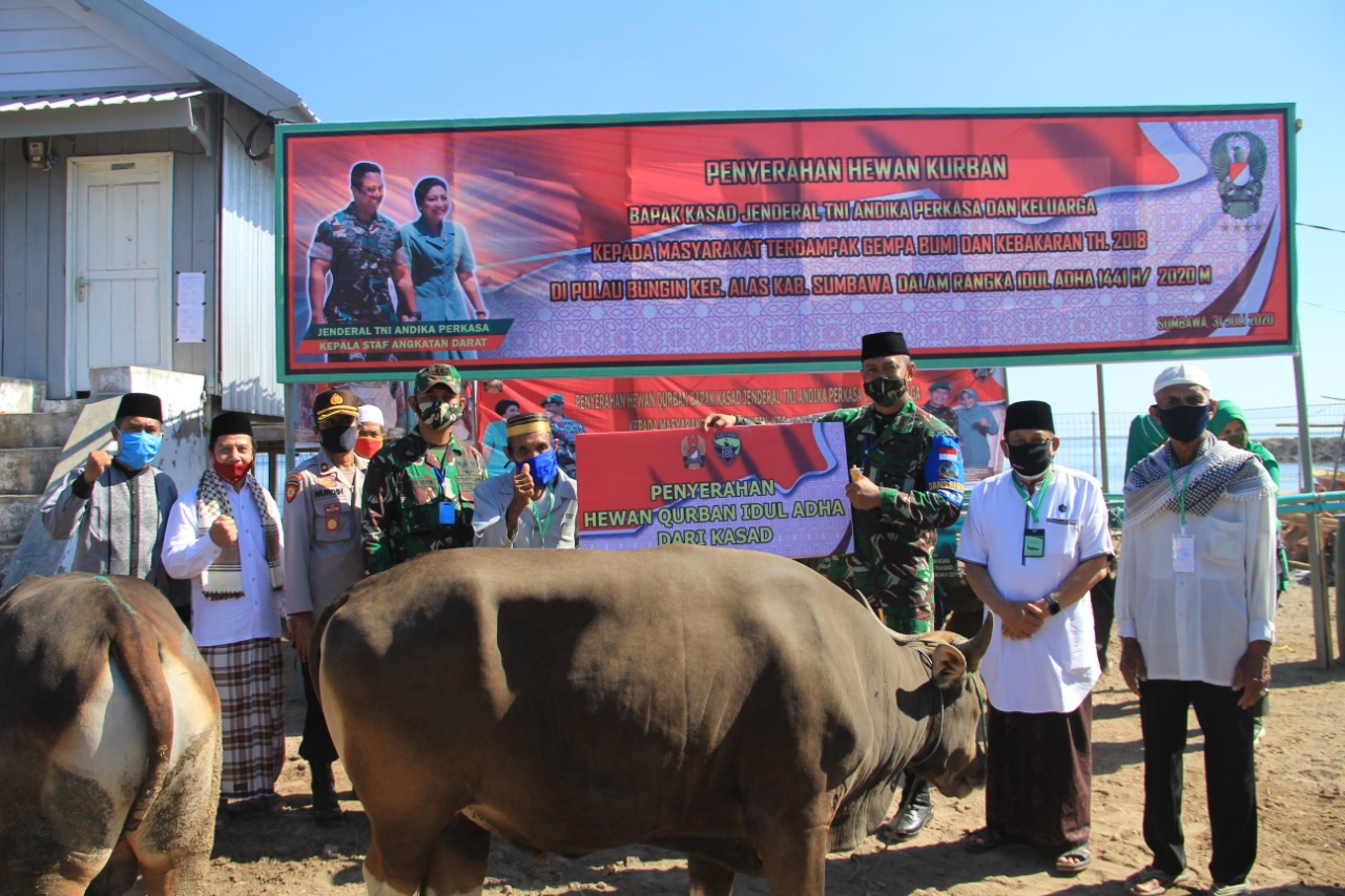 Alas, Sumbawa Besar – Kasad Jenderal TNI Andika Perkasa memberikan bantuan hewan kurban 16 ekor sapi yang disalurkan melalui Danrem 162/WB, membuat suasana perayaan Idul Adha 10 Dzulhijjah 1441 H hari ini disambut dengan suka cita oleh masyarakat pulau Bungin. Kegiatan diawali dengan penyerahan hewan kurban secara simbolis, dilanjutkan pemotongan, paking daging dan bumbu, penyerahan daging qurban dan bumbu, pemberian masker dan sarung tangan secara simbolis langsung kerumah warga oleh Danrem 162/WB beserta ibu ketua Persit KCK Koorcab Rem 162/WB dan Wakil Bupati Sumbawa besar.