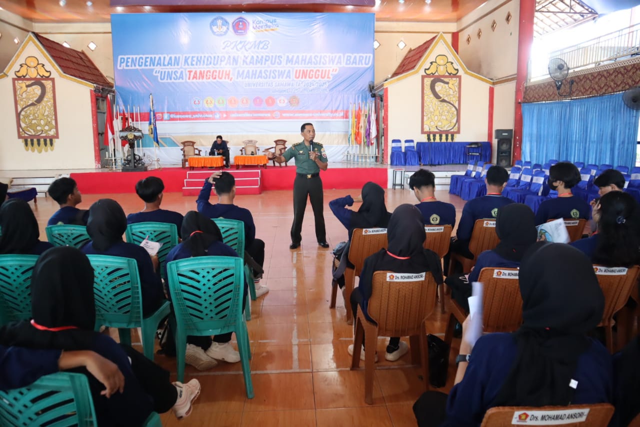 Sumbawa Besar, NTB — Dalam rangka memperkenalkan kehidupan kampus serta menanamkan nilai-nilai kebangsaan kepada generasi muda, Kasdim 1607/Sumbawa, Mayor Inf Dahlan, S.Sos., memberikan materi wawasan kebangsaan kepada para mahasiswa dan mahasiswi baru Universitas Samawa. Kegiatan ini berlangsung di Auditorium Universitas Samawa pada Rabu (4/9/2024).