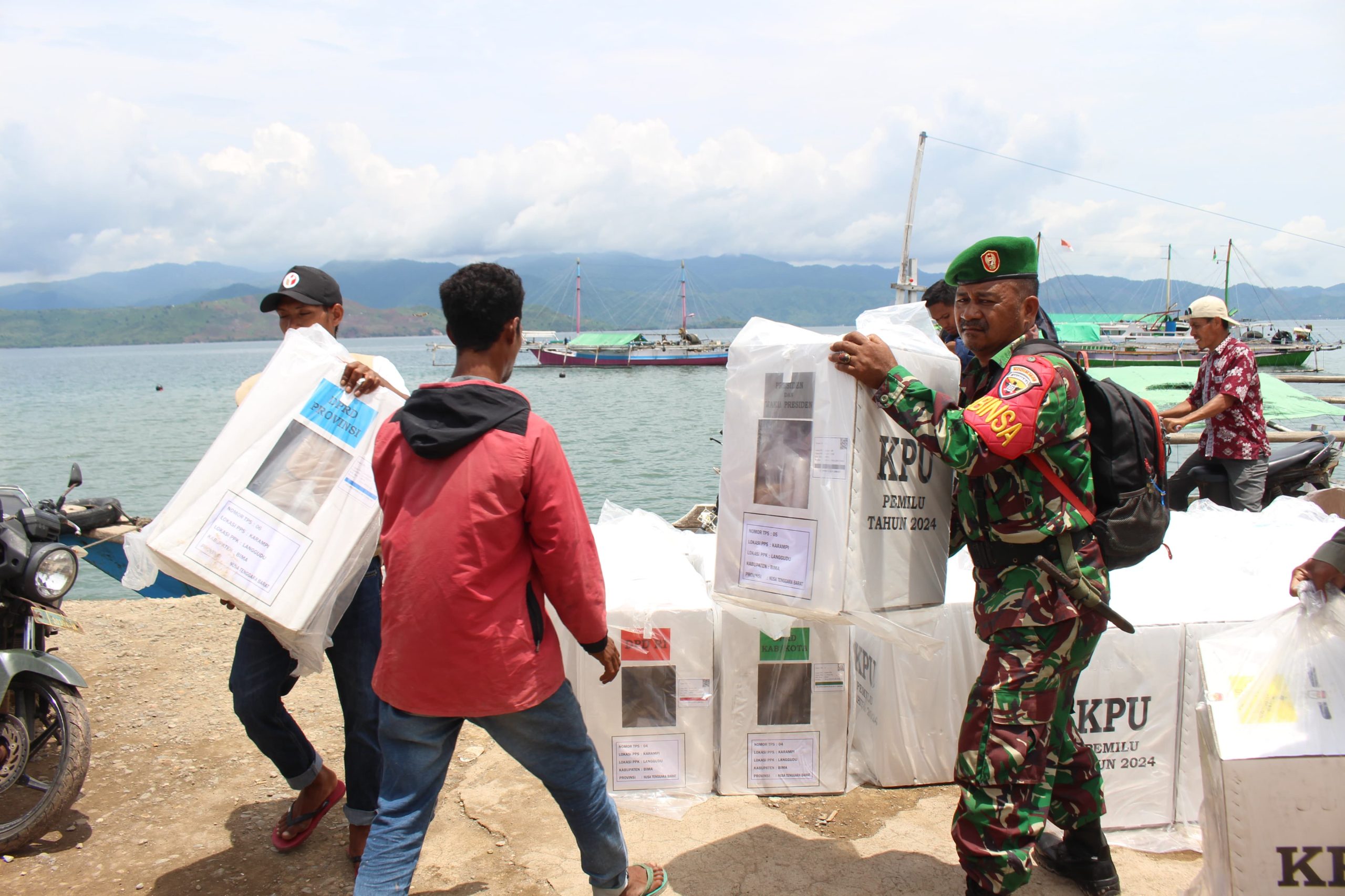 Bima NTB – Babinsa Desa Kerampi Serma Juwaidin, Babinsa Desa Sarae Ruma Serda Ridwan, Babinsa Desa Wadu Ruka Serka Busran.Pastikan logistik Pemilihan Umum (Pemilu) 2024 dapat didistribusikan ke tiap wilayah sebelum pemilihan berlangsung. Bahkan, untuk menjangkau wilayah pelosok pesisir, distribusi menggunakan perahu kayu. Selasa (13/02/24).