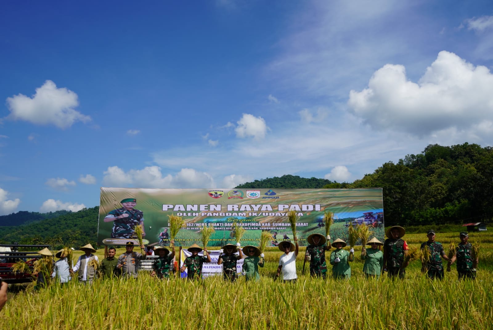 Sumbawa Barat, NTB– Dusun Mekar Sari, Desa Bangkat Monteh, Kecamatan Brang Rea, Kabupaten Sumbawa Barat menjadi saksi suksesnya panen raya padi yang dihadiri oleh Pangdam IX/Udayana, Mayor Jenderal TNI Muhammad Zamroni, S.I.P., M.Si., dan Ketua Persit KCK PD IX/Udayana, Ny. Dessy Efridesny yang didampingi oleh Komandan Korem 162/Wira Bhakti, Brigjen TNI Moch. Sjasul Arief, S.Sos., beserta rombongan dan Forum Koordinasi Pimpinan Daerah (Forkopimda) Kabupaten Sumbawa Barat, Jum’at (14/3/2025).