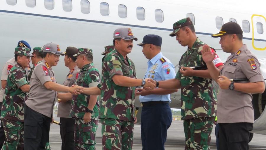 Dengan menggunakan Pesawat Boeing 737-400 A-7308 TNI AU dari Lanud Halim Perdanakusuma Jakarta Timur, kedatangan Panglima TNI dan Kapolri disambut oleh Pangdam IX/Udayana Mayjen TNI Benny Susianto, S.I.P., Panglima Komando Tugas Gabungan Terpadu (Pangkogasgabpad) Mayjen TNI Madsuni, S.E., Kapolda NTB Irjen Pol Drs. Achmad Juri, S.H., M.Hum, Danlantamal VII Kupang Brigjen TNI (Mar) Kasirun Situmorang, S.H., Danrem 162/Wira Bhakti Kolonel Czi Ahmad Rizal Ramdhani, S.Sos., S.H., M.Han. serta Danlanud Rembiga Kolonel Nav Budi Handoyo, M.Tr.(Han).