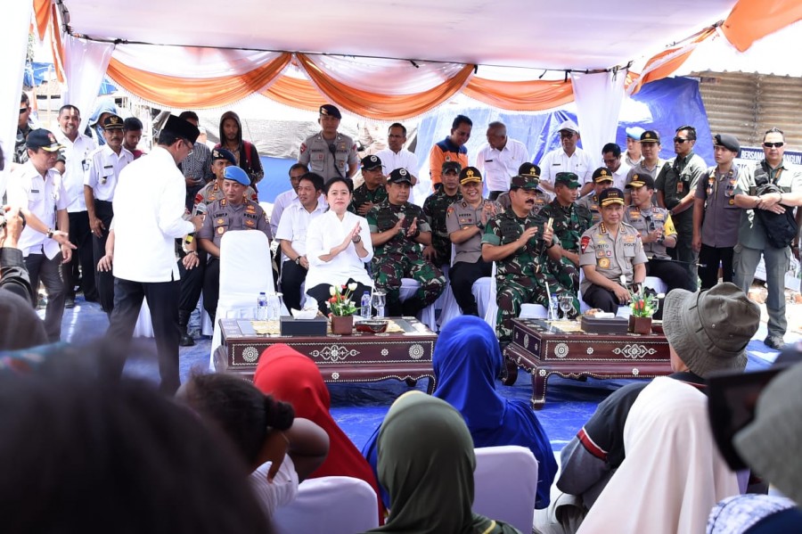 Mataram – Panglima TNI Marsekal TNI Hadi Tjahjanto, S.I.P. bersama Kapolri Jenderal Pol Prof. H. M. Tito Karnavian, Ph.D. dan Menteri Koordinator Bidang Pembangunan Manusia dan Kebudayaan (Menko Bidang PMK) Puan Maharani mengunjungi Posko Bersama Komando Tugas Gabungan Tepadu (Kogasgabpad) Nusa Tenggara Barat (NTB), bertempat di eks Bandara Selaparang, NTB, Rabu (17/10/2018).