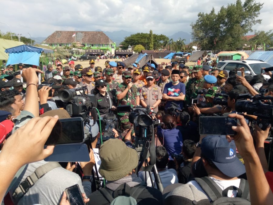 Tanjung – Kehadiran Panglima TNI Marsekal TNI Hadi Tjahjanto, S.IP., bersama Kapolri Jenderal Polisi Tito Karnavian di Posko bencana gempa bumi Kecamatan Tanjung Kabupaten Lombok Utara mendapat sorotan media. Dalam wawancaranya dengan sejumlah media usai meninjau Posko Kesehatan dan Posko Psikologi Sosial di Lapangan Tanjung KLU, Panglima TNI menyampaikan kedatangannya ke Posko bersama Kapolri dan Menteri Kesehatan setelah mendengarkan laporan dari Dansatgas penanggulangan bencana alam gempa bumi (Danrem 162/WB Kolonel Czi Ahmad Rizal Ramdhani, S.Sos., SH., M.Han) dan Gubernur NTB TGB Dr. H. Zainul Majdi MA., bahwa di enam Kecamatan ini yang sangat diperlukan ada tiga. “Air bersih, MCK dan Tenda”, sebut Hadi.