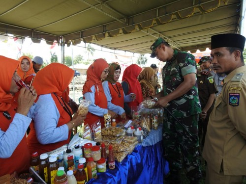 Sebelum melakukan peninjauan lokasi TMMD, Danrem 162/WB bersama rombongan menyempatkan diri untuk melihat stand dan mencoba mencicipi makanan khas Dompu yang disediakan oleh stand pasar murah.