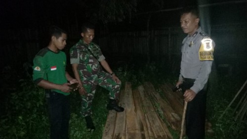 Sumbawa – Patroli gabungan Timsus Kodim 1607/Sumbawa Serda Efran, Kasi Pengamanan Hutan Suparman, S.Hut bersama anggota KPH Batu Lanteh dan anggota Polsek Unter Iwes Junafri berhasil mengamankan barang bukti berupa kayu olahan dalam bentuk balok di Kawasan Perum Perhutani (Hutan Jati) Dusun Boak B Desa Boak Kecamatan Unter Iwes Kabupaten Sumbawa, Jumat malam (22/2/2019).