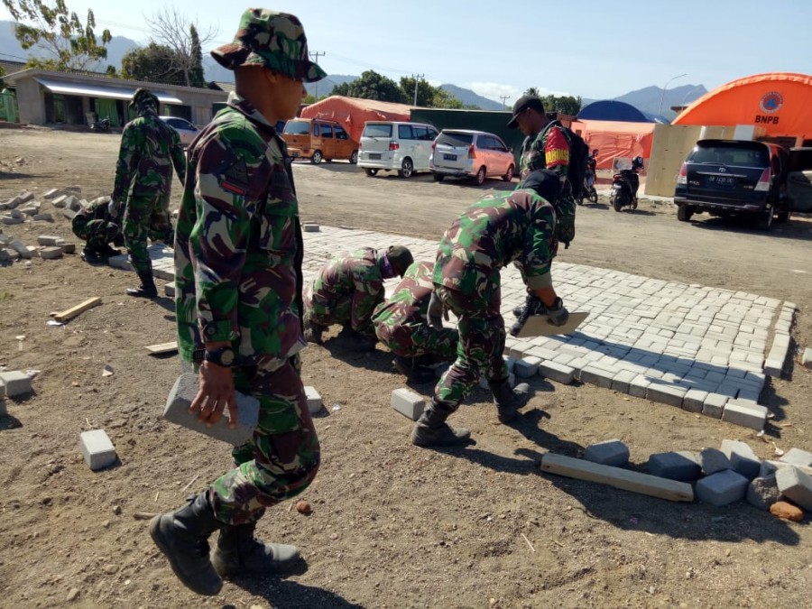 Tanjung – Dalam rangka mempercepat pembangunan RSUD Tanjung khususnya di halaman depan, Danrem 162/WB Kolonel Czi Ahmad Rizal Ramdhani, S.Sos., SH., M.Han., memberikan instruksi untuk membantu pemasangan paping blok halaman RSUD Tanjung Kabupaten Lombok Utara (KLU), Kamis (13/9).
