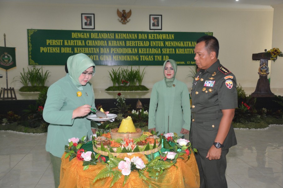 Peringatan hari ulang tahun ke 72 tahun 2018, persatuan Istri tentara Kartika Candra Kirana (Persit KCK) Korcab 162 Mataram menggelar acara syukuran dengan pemotongan nasi tumpeng oleh Ketua Persit KCK Korcab 162 Ibu Shally Farid Makruf yang didampingi Danrem 162/WB Kolonel Inf H. Farid Makruf, M.A., di Aula Sudirman Makorem 162/WB Mataram, Kamis (12/4).