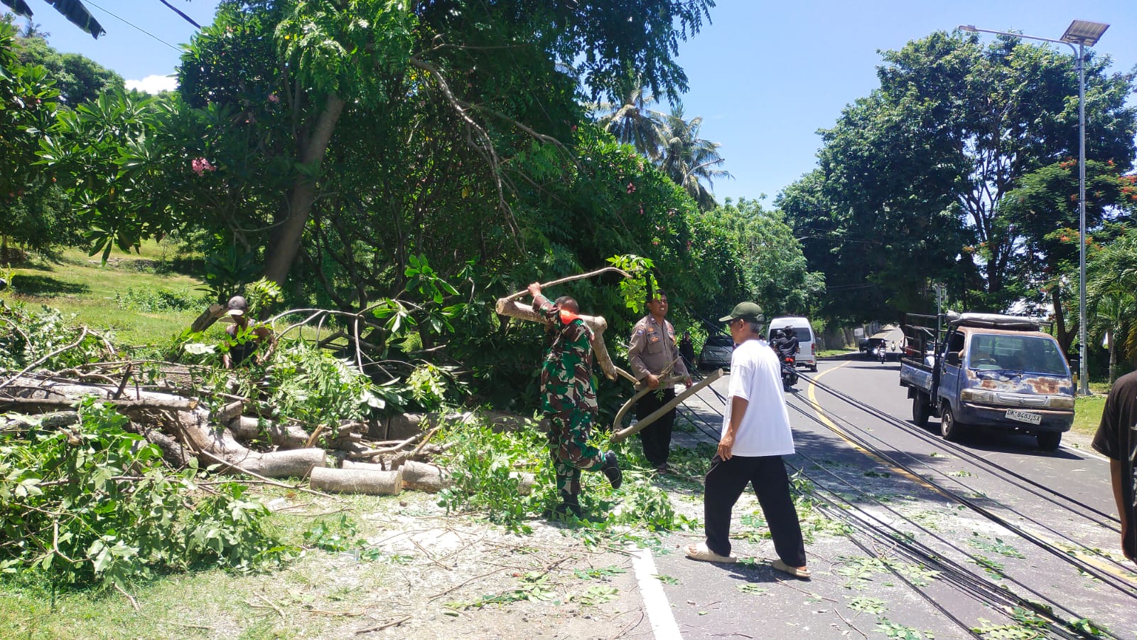 Babinsa bersama Kepala Desa, Bhabinkamtibmas, Linmas dan warga Desa Senggigi segera bergerak untuk membersihkan pohon yang tumbang dan melakukan penebangan terhadap pohon-pohon lain yang berpotensi tumbang di jalan raya Senggigi Kerandangan. Kegiatan ini bertujuan untuk mengantisipasi terjadinya kecelakaan dan memperlancar arus lalu lintas di jalur wisata tersebut.