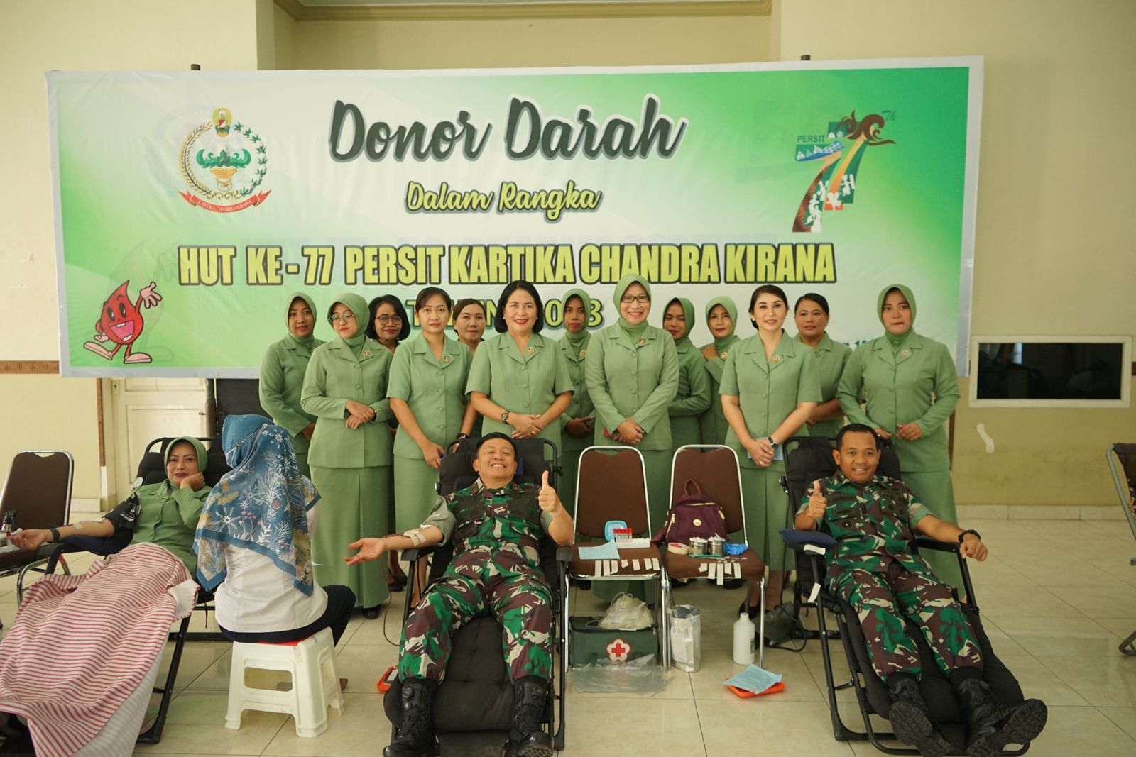 Mataram NTB – Danrem 162/WB Brigjen TNI Sudarwo Aris Nurcahyo S.Sos., M.M., didampingi Ketua Persit Kartika Chandra Kirana Koorcab Rem 162 PD IX/Udayana Ny. Asmeri Aris Nurcahyo melaksanakan kegiatan donor darah dalam rangka memperingati Hut yang ke -77 Persatuan Istri Tentara (Persit) diikuti oleh Anggota TNI-Polri se kota Mataram dan Ibu–ibu Persit Koorcab Rem 162 yang bertempat di Aula Sudirman Makorem 162/WB Jl. Lingkar Selatan No. 162, Kota Mataram Selasa, (14/03).