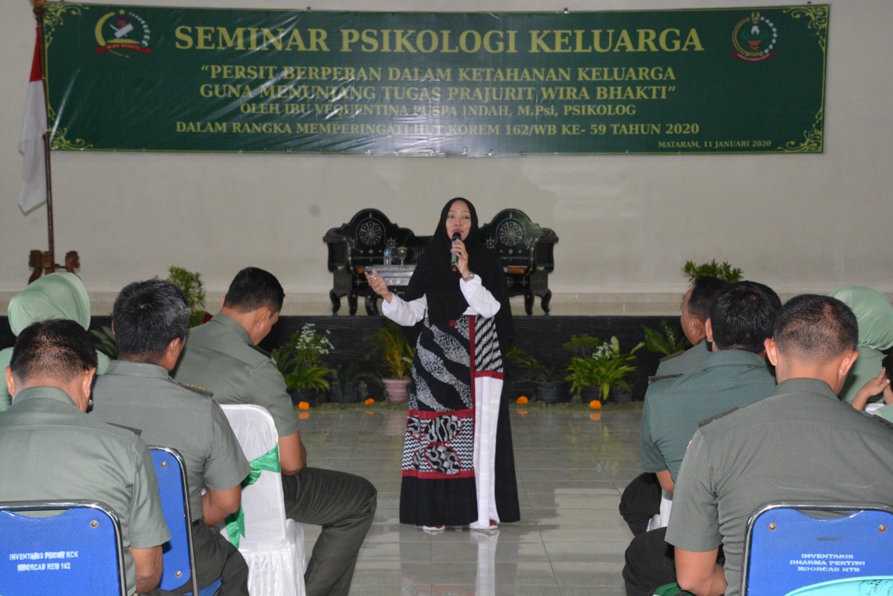 Mataram – Dalam rangka menyambut HUT Korem 162/WB ke 59 tahun 2020, Persit Kartika Chandra Kirana Koorcab Rem 162 menggelar seminar Psikologi Keluarga yang disampaikan Ibu Vequentina Puspa Indah, M.Psi., di Aula Sudirman Makorem jalan Lingkar Selatan nomor 162 Mataram, Sabtu (11/1).