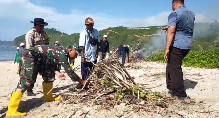 Lombok Tengah. – Jelang pergantian tahun anggota TNI AD Kodim 1620/Loteng melakukan kegiatan bersih pantai di kawasan pariwisata Torok Aik Belek, Desa Montong Ajan, Kecamatan Praya Barat Daya, Lombok Tengah, Nusa Tenggara Barat. Kegiatan Kick Of karya bakti dan penanaman pohon pelindung yang berlangsung Kamis, 28 Desember 2023, dipimpin Komandan Kodim 1620 /Loteng. Letkol Kav I.F Andi Yusuf Kertanegara, yang diikuti Kapolsek Praya Barat Daya, IPDA Aswin Anggara serta pemerintah desa setempat.