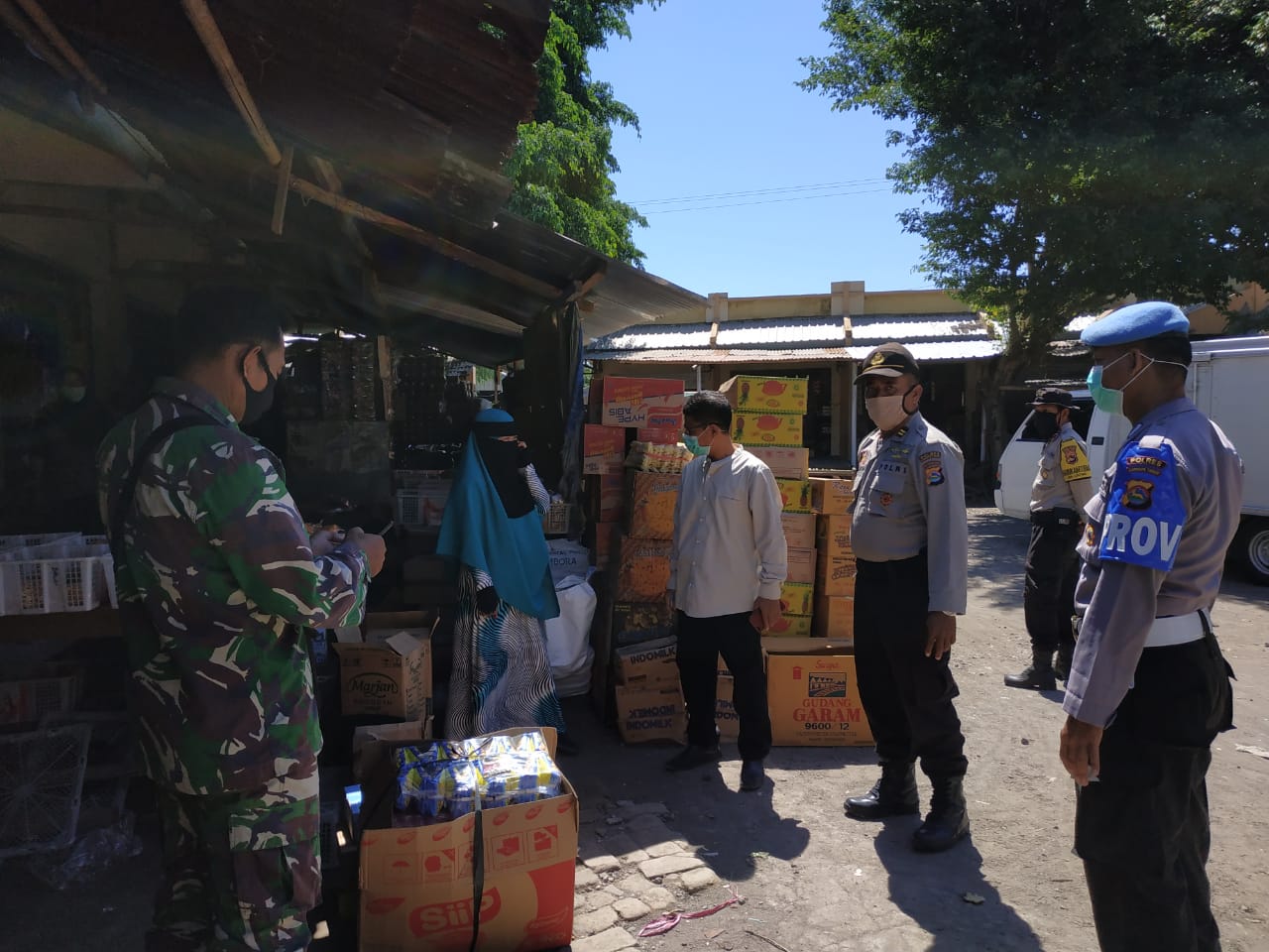 Lombok Timur – Danposramil Sakra Timur Koramil 1615-07/Sakra Pelda Sahabudin bersama anggota yang tergabung dalam Tim Satgas Gugus Tugas Percepatan Penanganan virus corona (Covid-19) memberikan imbauan kepada para pengunjung dan pedagang pasar Lepak dan pasar Montong Tangi Kecamatan Sakra Lombok Timur, Jumat (24/4).