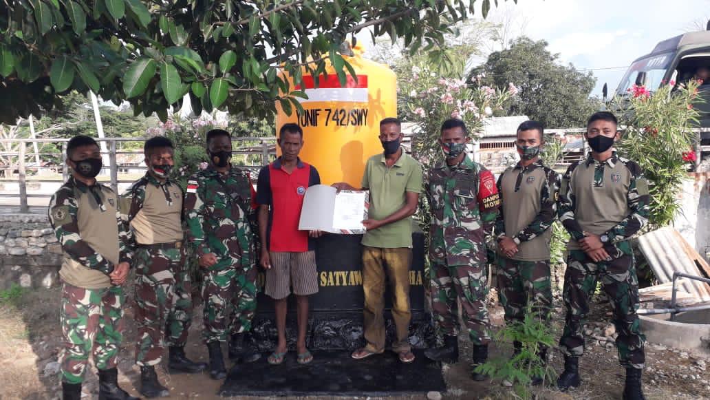 Belu NTT – Komandan Satgas pengamanan perbatasan Republik Indonesia dengan Republik Demokratik Timor Leste Sektor Timur Letnan Kolonel Inf Bayu Sigit Dwi Untoro melalui Pasiter Kapten Inf Ali Murtono menyerahkan bantuan lima unit tandon (penampung) air bersih kepada masyarakat Desa Silawan Kecamatan Tasifeto Timur Kabupaten Belu Nusa Tenggara Timur, Jumat (16/4/2021).