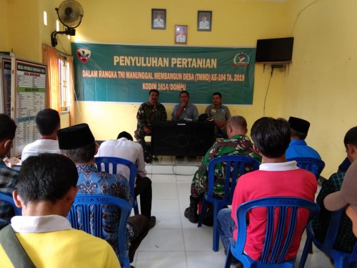 Dompu – Hari ini, Satgas TNI Manunggal Membangun Desa (TMMD) ke 104 tahun 2019 Kodim 1614/Dompu menggandeng UPT Pertanian Kecamatan Manggelewa untuk memberikan penyuluhan pertanian kepada masyarakat Dusun Jatimenge Desa Tekasire, Sabtu (16/3).