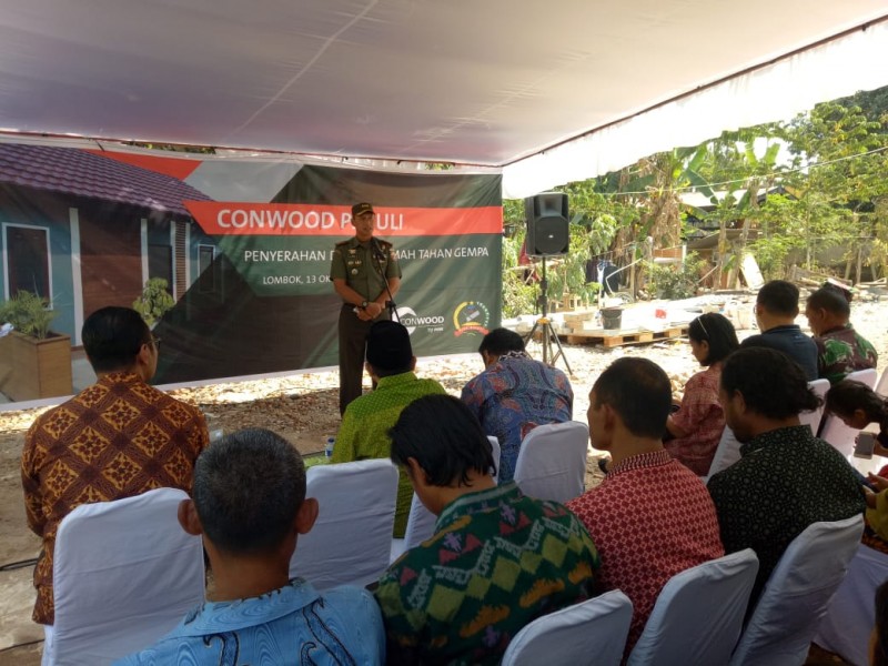 Usai memberikan sambutan, acara dilanjutkan dengan penyerahan penghargaan kepada anggota TNI yang membantu pembangunan rumah Conwood, penyerahan sembako secara sombolis oleh Danrem 162/WB kepada masyarakat KLU, penyerahan secara simbolis 200 Sajadah oleh Ibu Hera (Bursa Sajadah) dan Direktur Conwood, peresmian rumah Conwood secara simbolis oleh Direktur PT. Conwood dengan pemotongan pita dan penyerahan kunci rumah Conwood kepada empat orang anggota TNI yang berdinas di Korem dan Kodim 1606/Lobar.