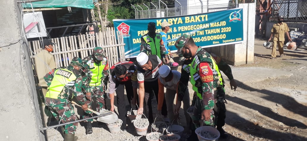 Bima – Menyambut HUT Ke–75 TNI tanggal 5 Oktober 2020 mendatang, Kodim 1608/Bima menggelar kegiatan Karya Bakti pengecoran Masjid Uwuludin bersama POLRI, Pol PP, Perangkat desa dan seluruh komponen Masyarakat yang Bertempat di Desa Bumi Pajo Kecamatan Donggo Kabupaten Bima,” Selasa (22/09/20).