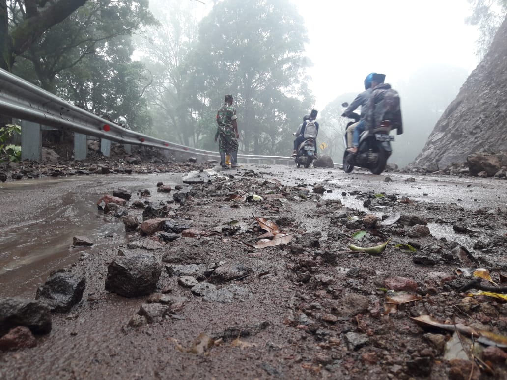 Lombok Timur – Tanah longsor dan bebatuan kembali berserakan dijalan raya Sebau menuju pusuk Sembalun Kecamatan Sembalun Lombok Timur terbawa air hujan. Awan gelap dan hujan deras sejak siang tadi mengakibatkan jalan sekitar pusuk Sembalun menjadi terganggu sehingga kendaraan roda dua harus berjalan lambat dan pelan, sedangkan kendaraan roda empat belum bisa melewati jalan akibat batu.