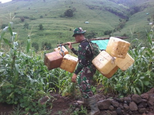 Melihat kondisi tersebut, Babinsa Tekasire Koramil 1614-06/Manggelewa Serka Syarifudin mengambil inisiatif mengangkut jerigen berisikan BBM untuk alat berat menggunakan kayu menuju lokasi alat berat.
