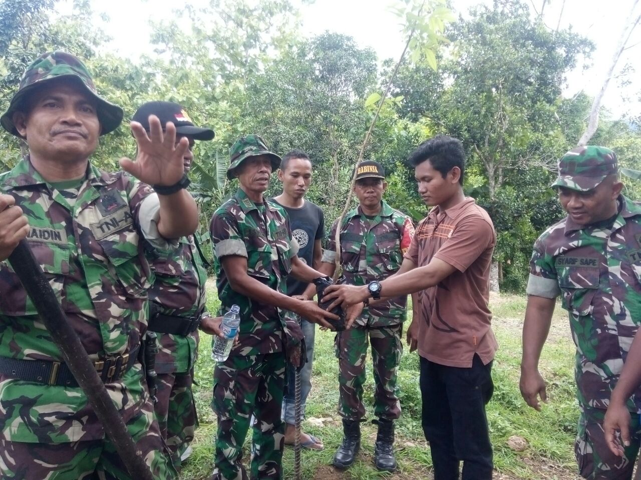 Usai penanaman pohon, Wadan Ramil 1608-07/Monta Kapten Inf Iswan menyampaikan penanaman pohon disekitar Dan Parado Desa Pela ini dalam rangka mengantisipasi hal-hal yang tidak kita inginkan mengingat pohon-pohon besar disekitar Dam sudah mulai sedikit bahkan tidak ada akibat penebangan pohon secara liar oleh oknum yang tidak bertanggung jawab.