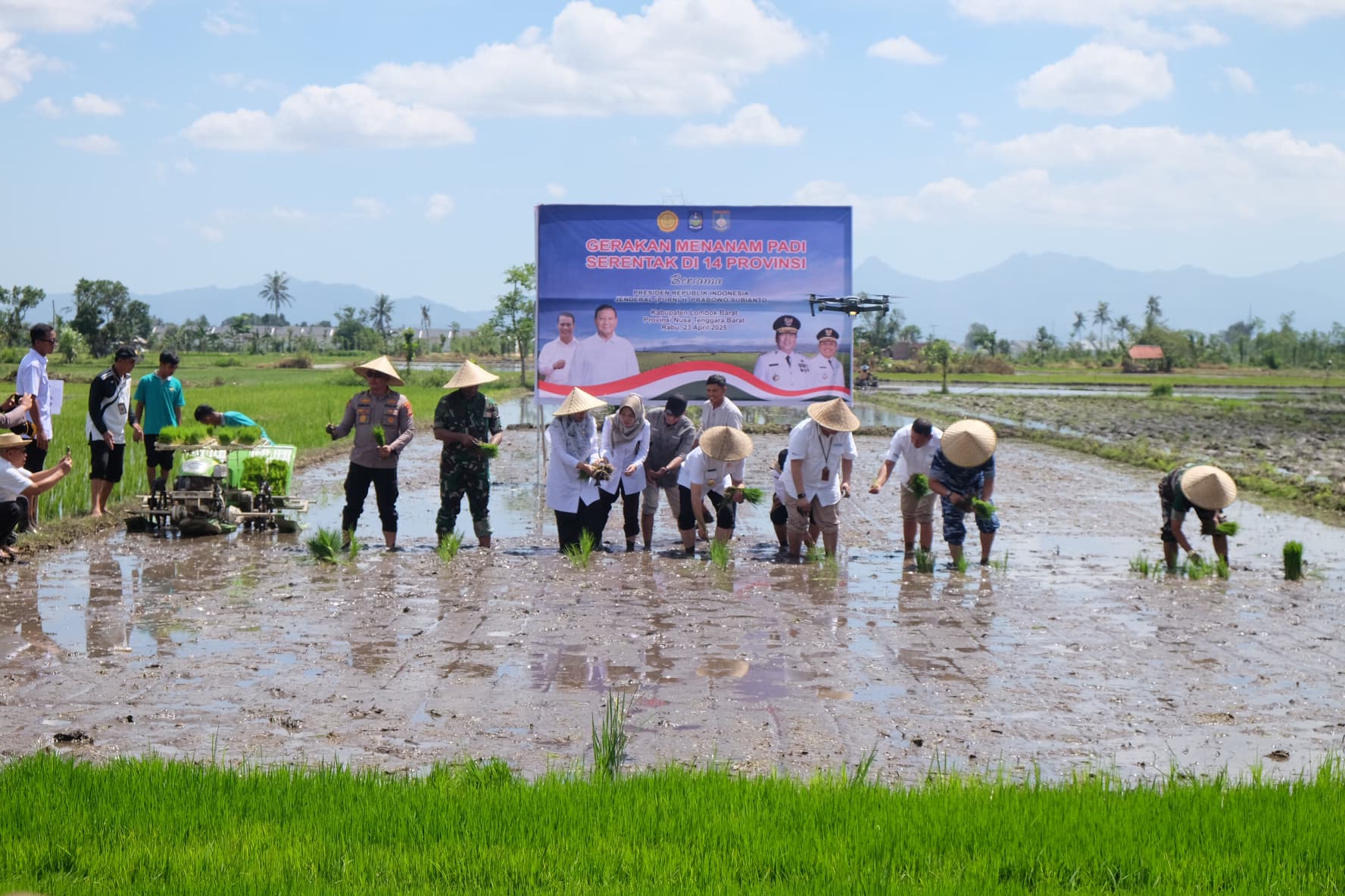 Lombok Barat, NTB – Suasana pagi di Kelompok Tani Pohdana Utara, Gerung Utara, terasa berbeda. Bukan hanya karena lumpur sawah yang membekas di kaki, tapi juga karena semangat luar biasa dari ratusan peserta yang ikut dalam Gerakan Menanam Padi Serentak Nasional. Kegiatan ini terkoneksi langsung via video conference (vicon) dengan Presiden RI, Jenderal (Purn) H. Prabowo Subianto, yang memimpin dari Kabupaten Banyuasin, Sumatera Selatan, Rabu (23/4/2025).