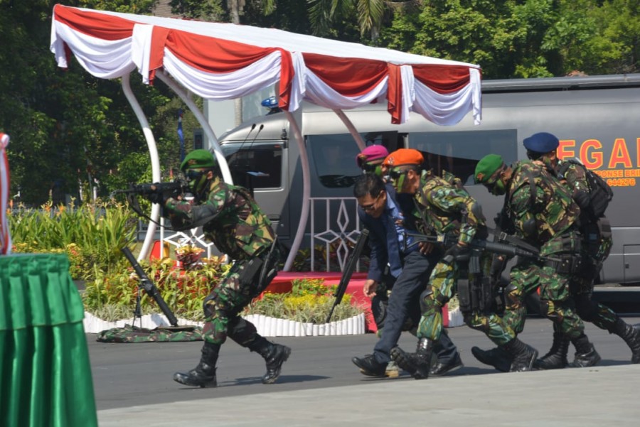 Mataram – Operasi pembebasan sandera yang dilaksanakan pasukan TNI Polri mencuri perhatian para peserta Upacara Peringatan HUT TNI ke 73. Pasalnya Kepala Dinas Pariwisata NTB Lalu Muhammad Faozal disandera oleh kelompok teroris di Kantor Gubernur NTB, Jumat (5/10).