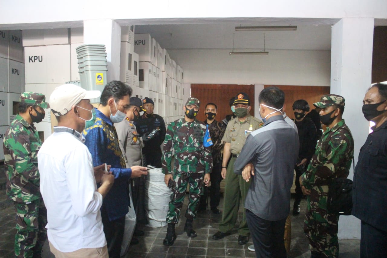 Sumbawa – Untuk memastikan distribusi logistik Pemilu aman, Dandim 1607/Sumbawa Letkol Kav Rudi Kurniawan, S.Sos, M.Tr (Han) bersama Kapolres Sumbawa AKBP Widy Saputra, S.Ik beserta Satgas Covid BUMN Kabupaten Sumbawa mengecek langsung gudang logistik di Gedung Islamic Center KPU Kabupaten Sumbawa, Jumat (27/11/2020).