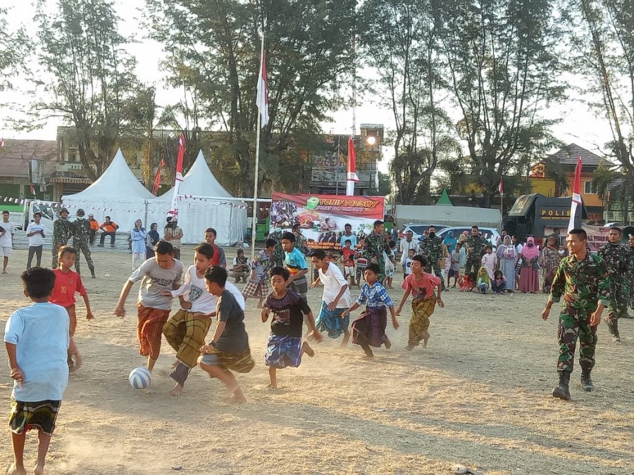 Sabtu sore (18/8), puluhan personel Yonif 742/SWY usai melaksanakan tugas pembongkaran dan pembersihan puing-puing reruntuhan bangunan akibat gempa menggelar pertandingan bola joget bagi anak-anak korban dengan menggunakan perlengkapan sarung di Lapangan Supersemar Tanjung Kabupaten Lombok Utara.