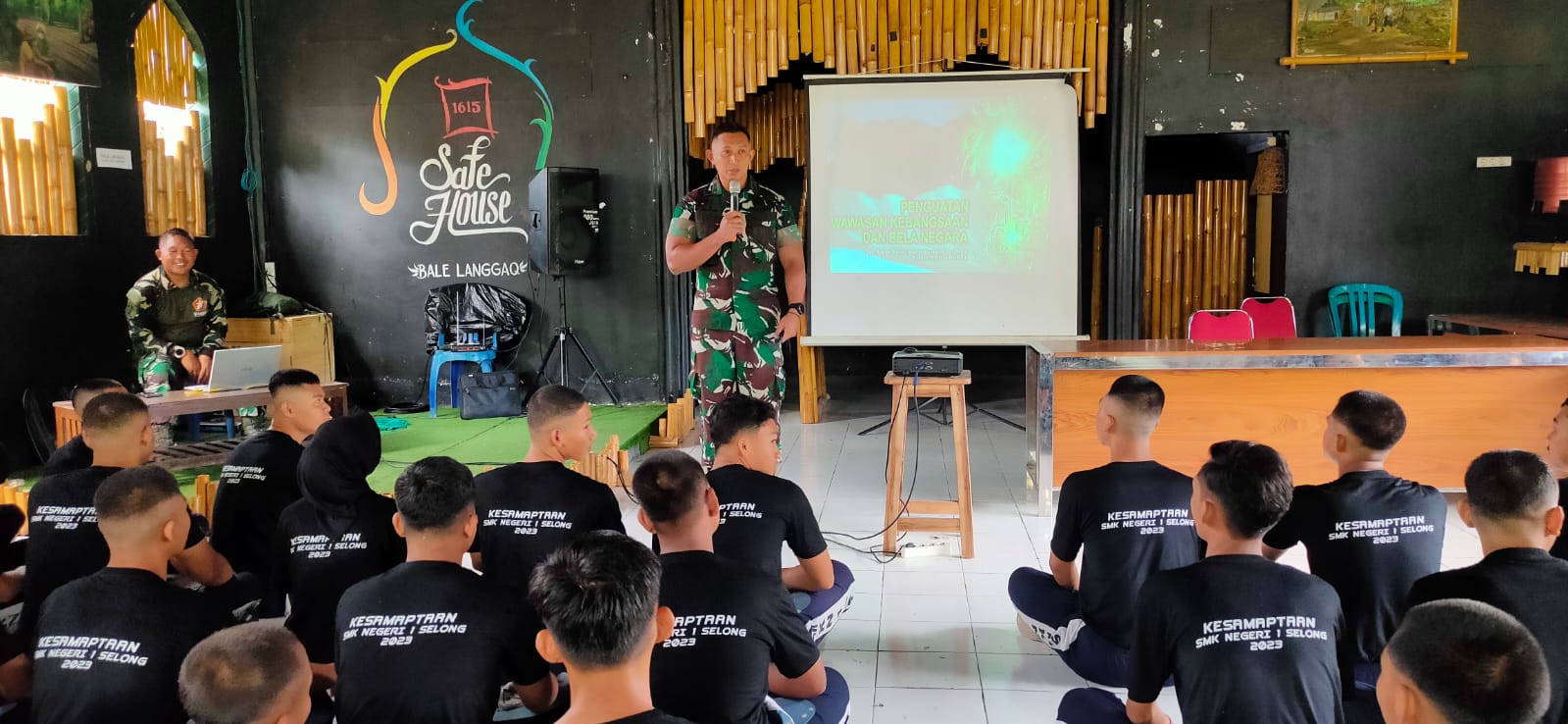 Lombok Timur – Komandan Kodim 1615/Lotim Letnan Kolonel Inf Bayu Sigit Dwi Untoro memberikan ceramah Penguatan Wawasan Kebangsaan kepada siswa-siswi SMK Negeri 1 Selong di Bale Langgak Makodim jalan Prof. M. Yamin Selong Lombok Timur, Jumat (17/11).
