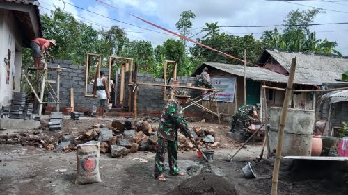 Lombok Timur – Pasca peletakan batu pertama oleh Danrem 162/WB Brigjen TNI Agus Bhakti dua Minggu lalu, bedah rumah tidak layak huni (RTLH) Praja Raksaka Peduli Rakyat di Dusun Bengkaung Lauk Desa Danger Kecamatan Masbagik Kabupaten Lombok Timur yang sedang dikerjakan Kodim 1615/Lotim terus mengejar target selesai Minggu depan.