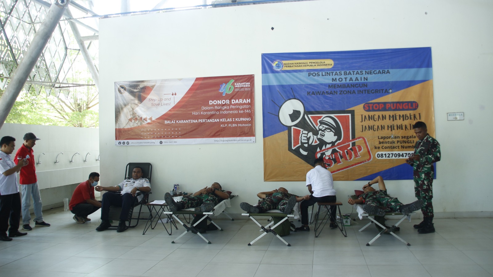 Belu, NTT – Dansatgas Pamtas RI-RDTL Sektor Timur Yonif 742/SWY Mayor Inf Trijuang Danarjati, S.A.P., bersama 25 anggota Pos yang ada di Jajaran Kipam I ikut serta dalam kegiatan donor darah dalam rangka peringatan Hari Karantina Indonesia ke-146 yang bekerja sama dengan PMI Kota Atambua bertempat di PLBN Motaain Kec. Tasifeto Timur Kab. Belu NTT. Rabu (11/10/2023).