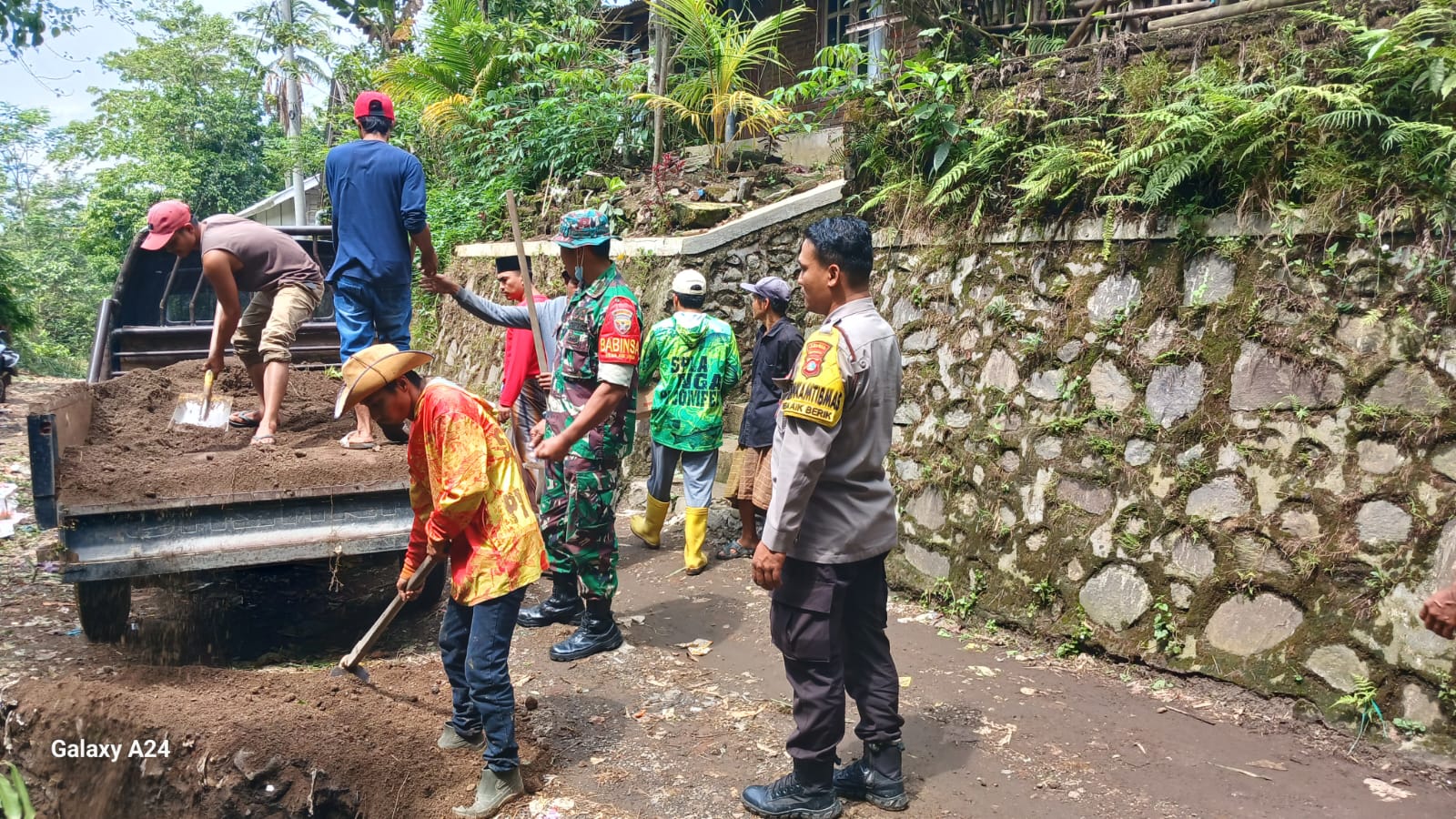 Dalam upaya tanggap dan respon cepat, Babinsa bersama Pemdes Aik berik mengorganisir warga setempat untuk bergotong royong membersihkan dan memperbaiki jalan yang rusak.