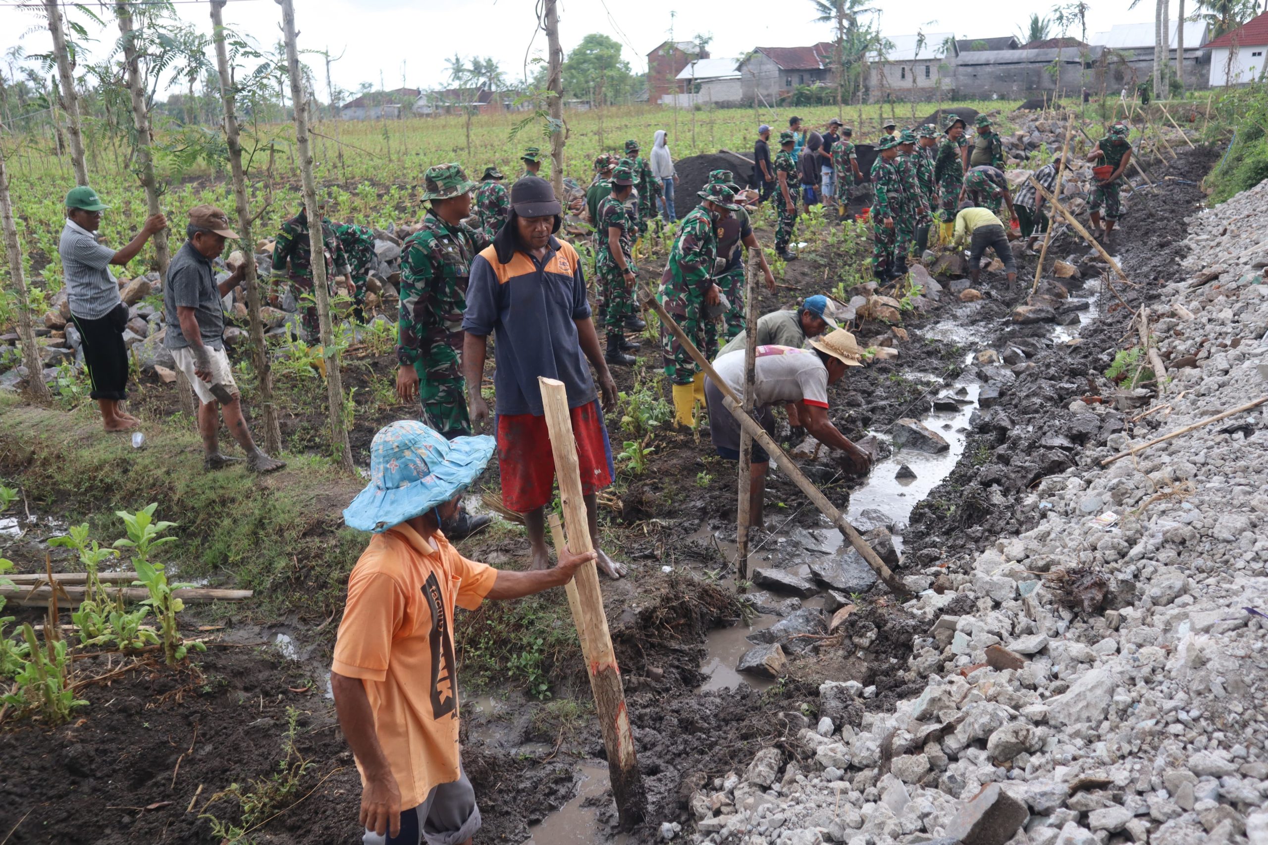 Usai apel pengecekan personel dan warga yang akan ikut karya bakti oleh Danramil 1615-07/Sakra Kapten Chb Ismail, seluruh peserta karya bakti langsung berhamburan menuju dua sasaran tersebut.