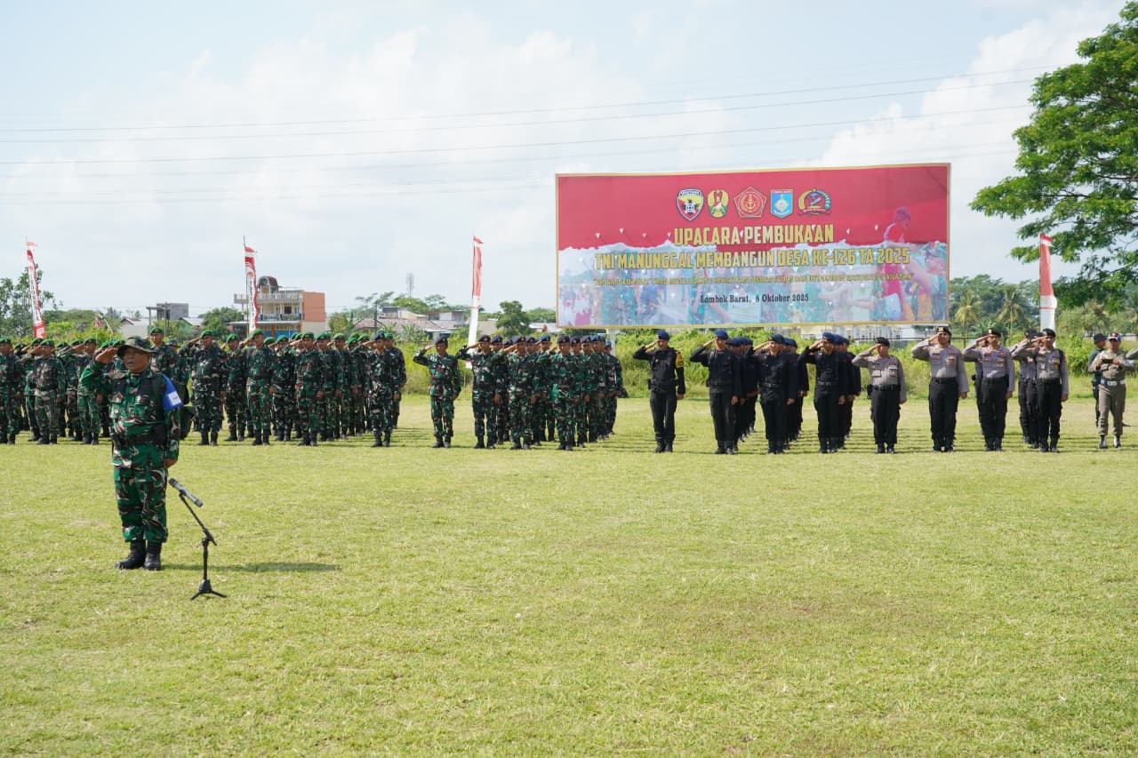 LOMBOK BARAT, NTB – Kepala Staf Korem 162/Wira Bhakti, Kolonel Inf Wirawan Eko P, S.E., M.H., mewakili Komandan Korem 162/WB, menghadiri upacara pembukaan TNI Manunggal Membangun Desa (TMMD) ke-126 Kodim 1606/Mataram Tahun Anggaran 2025. Kegiatan yang bertujuan mempercepat pembangunan dan meningkatkan kesejahteraan masyarakat ini dipusatkan di Lapangan Sepak Bola Dusun Gegutu Reban, Desa Dasan Geria, Kecamatan Lingsar, Kabupaten Lombok Barat, Rabu (8/10/2025).